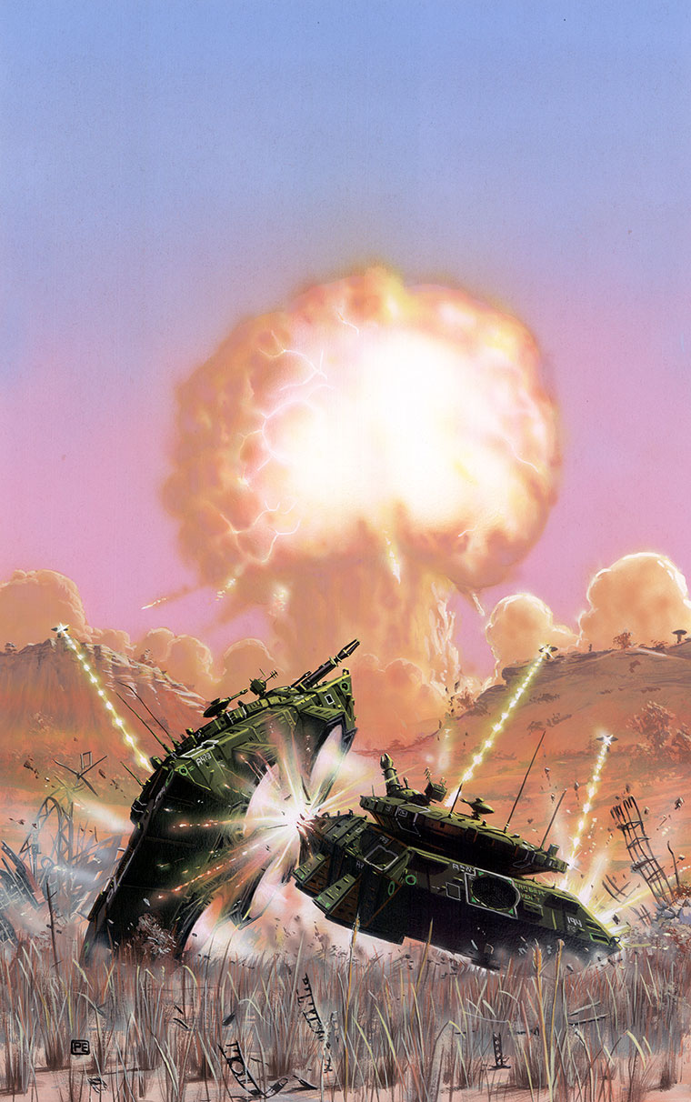 The battle scene here is in so many ways real. How often have allied vehicles collided whilst avoiding enemy fire in R/L history? Why not in the future, too? Excellent use of depth and subject matter, I think.