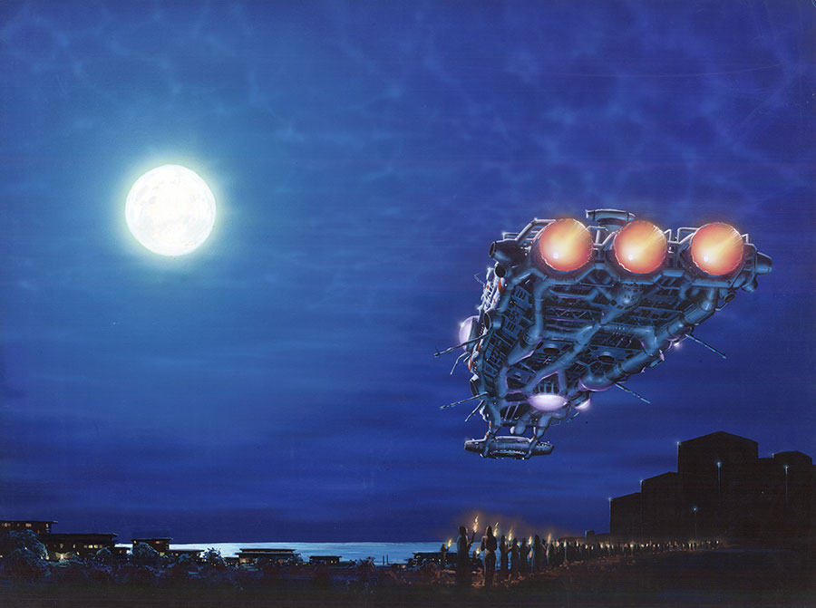 Tags: spaceship, landscape, moon, village, gathering